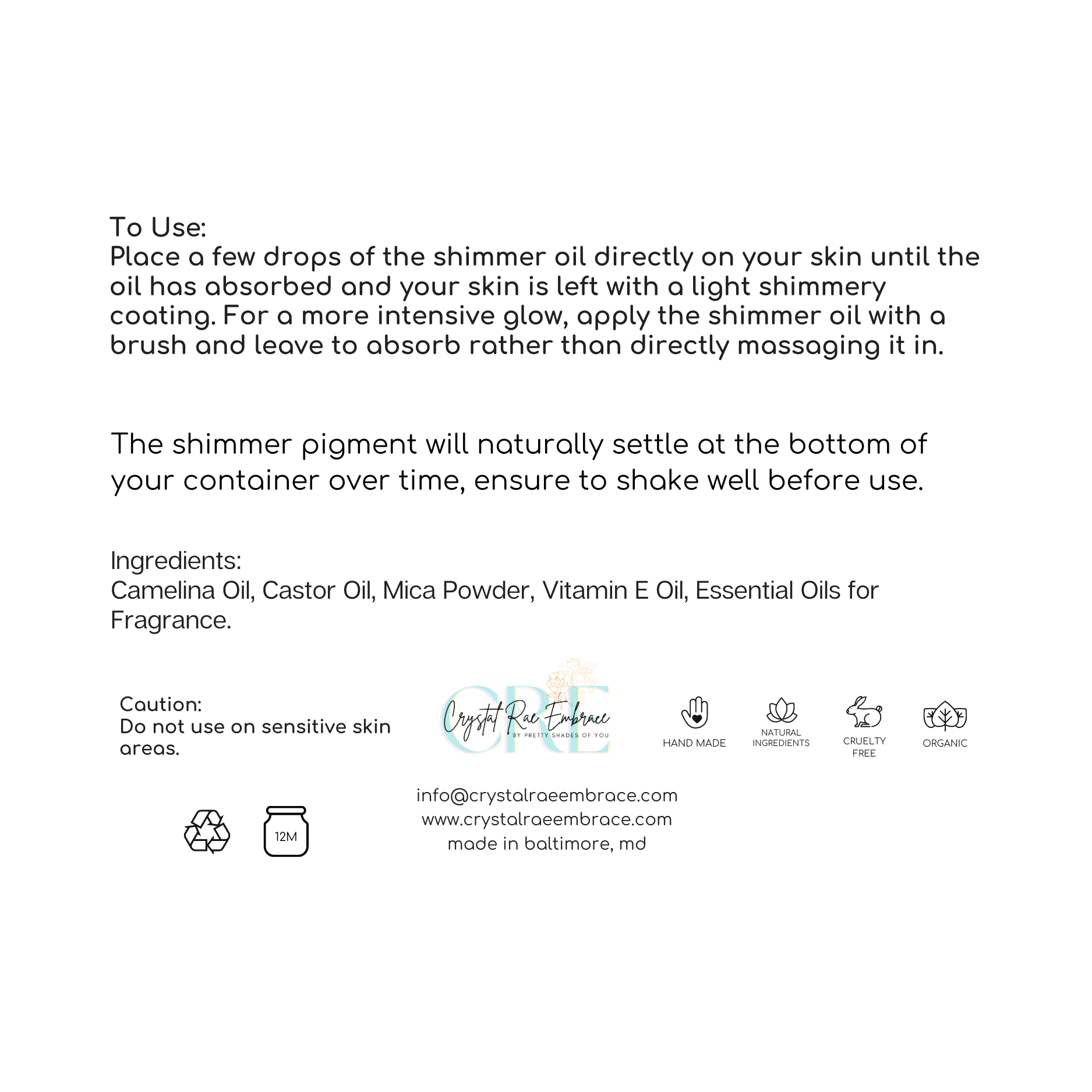 Embrace your inner glow with our Natural Shimmer Oil, a luxurious addition to your skincare routine for a beautifully luminous and nourished complexion.