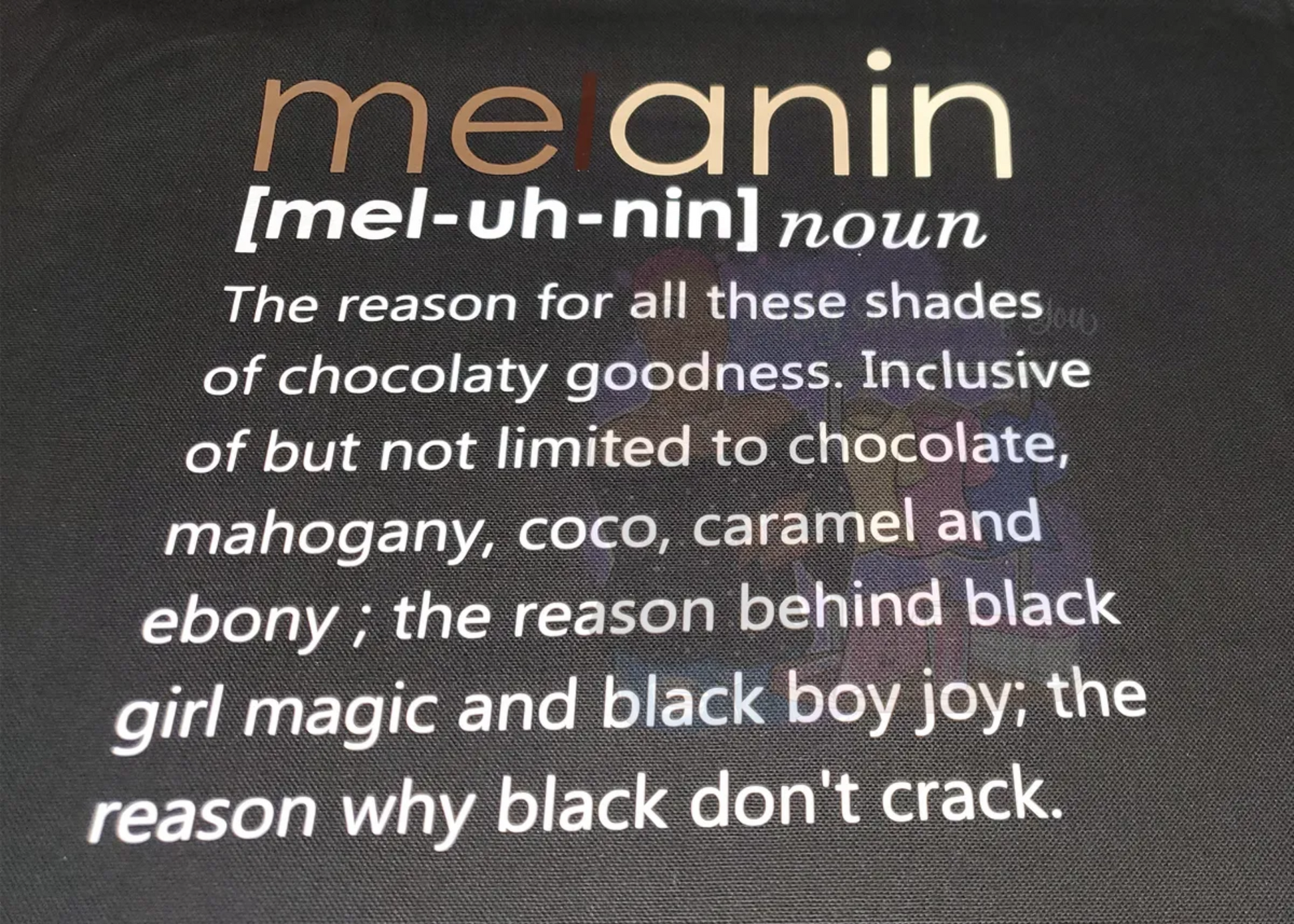 - Design: The shirt showcases the word "Melanin" in bold lettering, followed by a fun and inspiring definition: "The reason for all these shades of chocolaty goodness... The reason behind Black girl magic and Black boy joy; the reason why Black don’t crack."