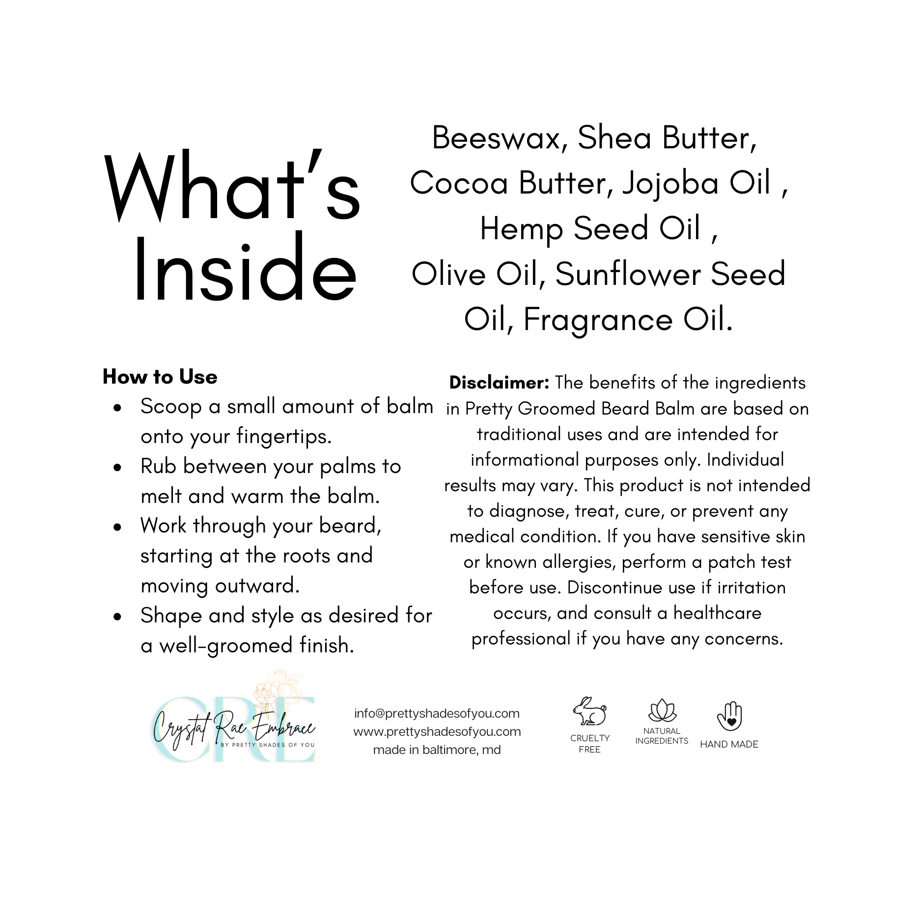 The benefits of the ingredients in Pretty Groomed Beard Balm are based on traditional uses and are intended for informational purposes only. Individual results may vary. This product is not intended to diagnose, treat, cure, or prevent any medical condition. If you have sensitive skin or known allergies, perform a patch test before use. Discontinue use if irritation occurs, and consult a healthcare professional if you have any concerns.