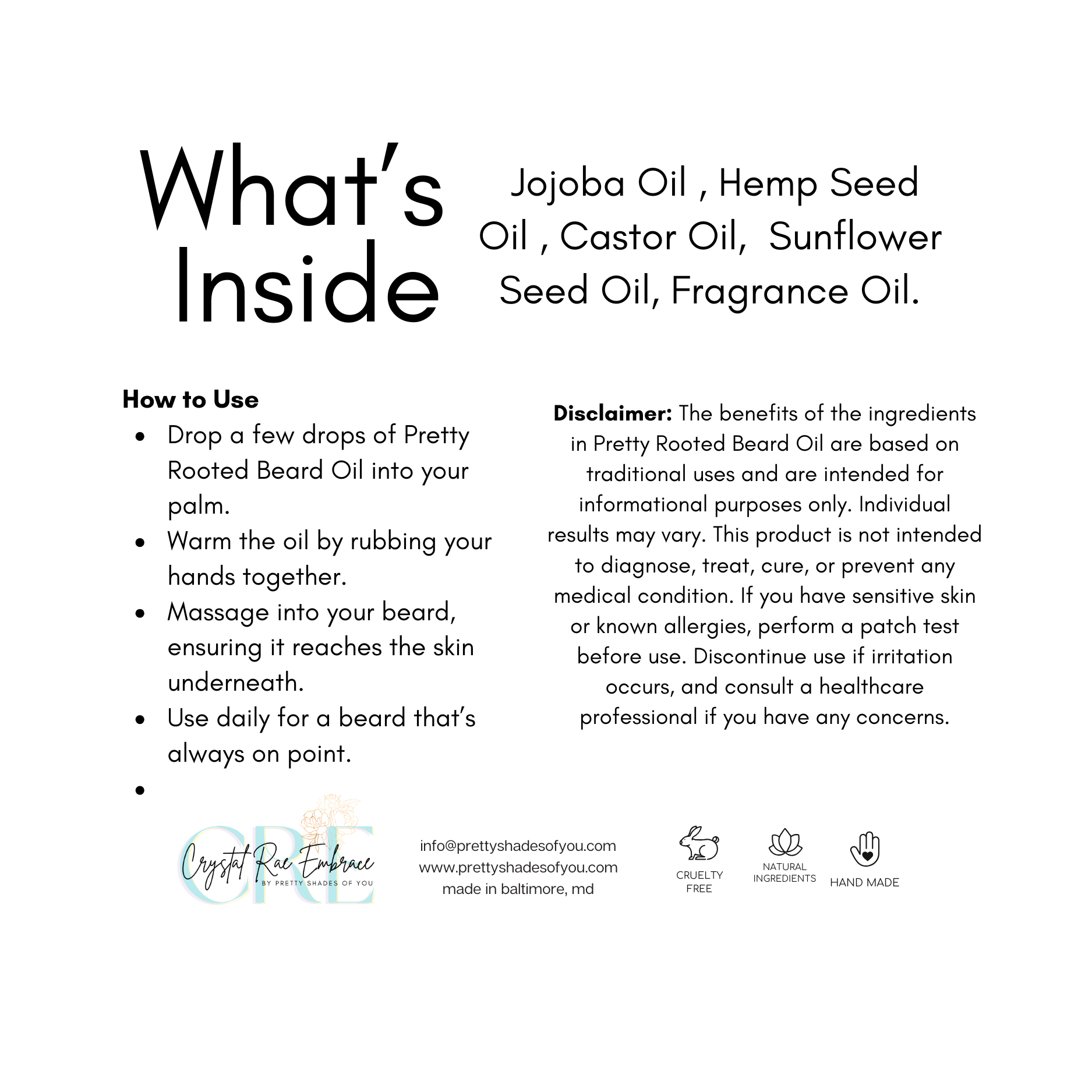 The benefits of the ingredients in Pretty Rooted Beard Oil are based on traditional uses and are intended for informational purposes only. Individual results may vary. This product is not intended to diagnose, treat, cure, or prevent any medical condition. If you have sensitive skin or known allergies, perform a patch test before use. Discontinue use if irritation occurs, and consult a healthcare professional if you have any concerns.